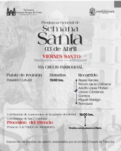 El Viernes Santo se vivirá uno de los momentos más emblemáticos con el Viacrucis, que iniciará a las 13:00 horas en el Pabellón Cultural y concluirá en la parroquia. Posteriormente, a las 16:00 horas, se llevará a cabo la celebración de la Pasión del Señor, que incluye el sermón de las Siete Palabras, la Procesión del Silencio y el pésame a la Virgen de los Dolores.