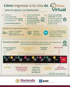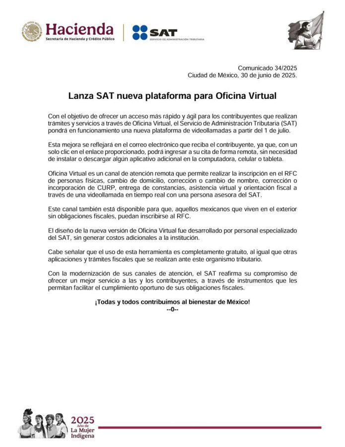 El SAT informa que, a partir del 1 de julio, estará disponible una nueva plataforma de videollamadas en Oficina Virtual, con el objetivo de agilizar el acceso a trámites y servicios de manera remota. Esta actualización permitirá ingresar a la cita en línea directamente desde el enlace recibido por correo electrónico, sin necesidad de descargar aplicaciones adicionales en la computadora, celular o tableta. El uso de esta herramienta es gratuito.