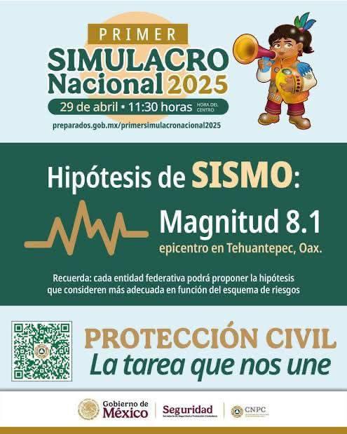 Debido al Primer Simulacro Nacional de 2025 la alerta sísmica se activará en 11 estados del país como parte de las acciones de prevención a la población. De acuerdo con las autoridades la hipótesis del sismo será de magnitud 8.1 con epicentro en Tehuantepec, Oaxaca.
