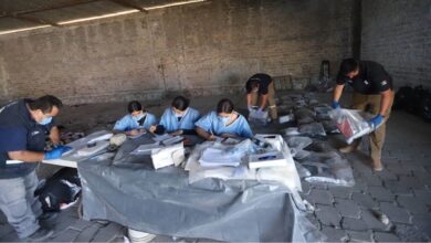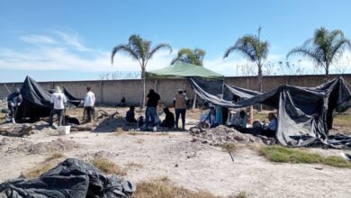 Altar a la Santa Muerte y notas sobre armas, entre los hallazgos en rancho Izaguirre en Teuchitlán, Jalisco.