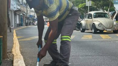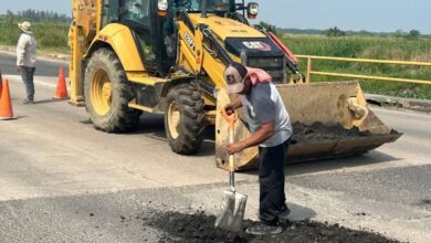 Este día, personal de la Dirección de Servicios Municipales lleva a cabo trabajos de bacheo en la carretera Nanchital.