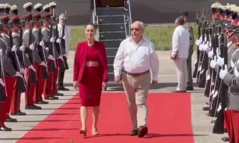 Petén, Guatemala/ La presidenta de México, Claudia Sheinbaum, arribó este jueves al Aeropuerto Internacional Mundo Maya, en el departamento de Petén, donde fue recibida con honores por el canciller guatemalteco Carlos Ramiro Martínez.