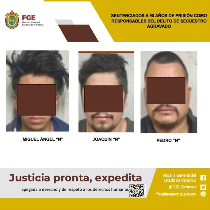 Xalapa, Ver., 4 de julio de 2025.-La Fiscalía General del Estado, a través de la Unidad Especializada en Combate al Secuestro, logró sentencia condenatoria de 90 años de prisión en contra de Miguel Ángel “N”, Joaquín “N” y Pedro “N” como responsables del delito de secuestro agravado, cometido en agravio de la víctima identificada con las iniciales S.T.L.